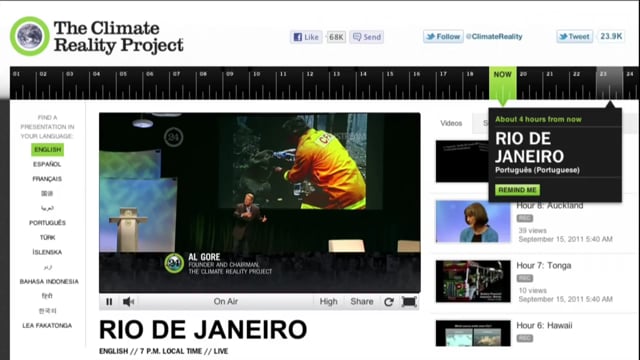 Project description: The Climate Reality Project, founded and chaired by former Vice President Al Gore, held its second annual online event November 14-15, 2012 entitled 24 Hours of Reality: The Dirty Weather Report, to connect the dots between global climate change and the extreme weather we're experiencing.
